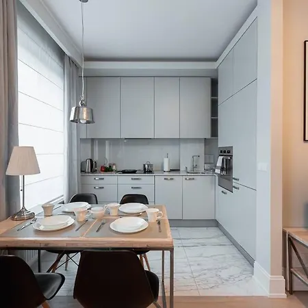 A fully furnished kitchen at Cozy, Bright Apartment, Garage, Mokotow includes an oven and a dishwasher. Cozy, Bright Apartment, Garage, Mokotow is only 150 metres from Metro Raclawicka 02 bus stop and just steps from Racławicka underground station. A patio invites guests to relax on.